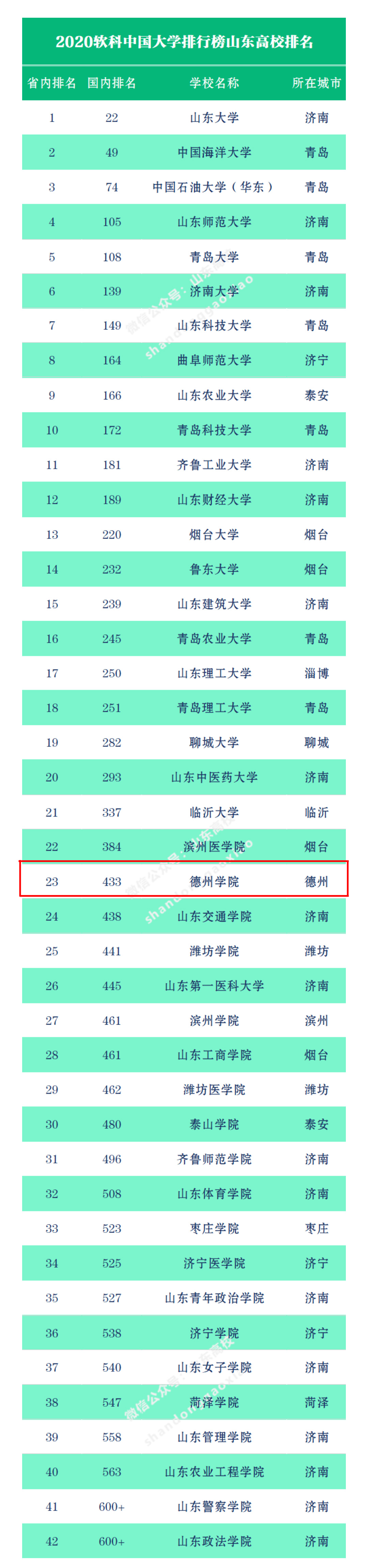 2020年软科中国大学排名于5月15日发布,我校总得分88.2分,综合排名居全国第433位,较2019年的第537位跃升104位。在山东省内的综合排名是第23位,较2019年的第28位提升5位。