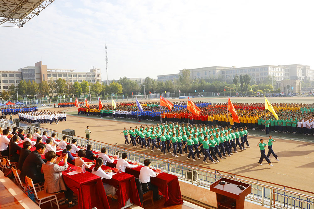 鲜红的国旗在国旗护卫队的护卫下庄严入场,全体师生肃然起立,面向国旗行注目礼。大会在嘹亮的国歌声中拉开序幕,分列式开始。