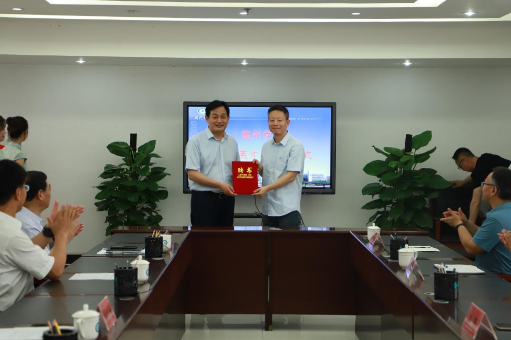 赵胜村代表学校与李菂签订了聘用合同并颁发聘书。他表示,李菂受聘德州学院,将进一步促进我校多学科交叉融合及天文大数据中心建设。希望李菂发挥自身优势,认真履行聘用合同,带动计算机与信息学院、物理与电子信息学院的人才培养与学科建设进一步提升。有关单位要切实做好服务保障工作,与专家多沟通交流,将“天衢英才”杰出人才的作用发挥到实处。