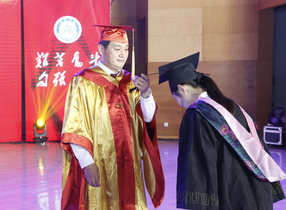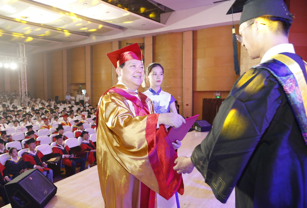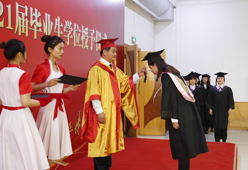 6月23日,2021届毕业生学位授予仪式在厚德楼四楼报告厅举行,校长赵胜村为全体本科毕业生逐一“拨穗正冠”授予学位,颁发学士学位证书,并合影留念。