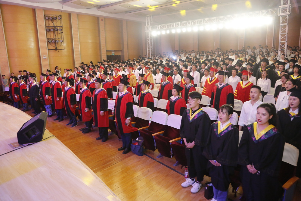 伴随着暖场节目《我们的梦》《夜空中最亮的星》《星辰大海》和毕业视频短片的播放,毕业典礼在庄严的国歌声中拉开帷幕。