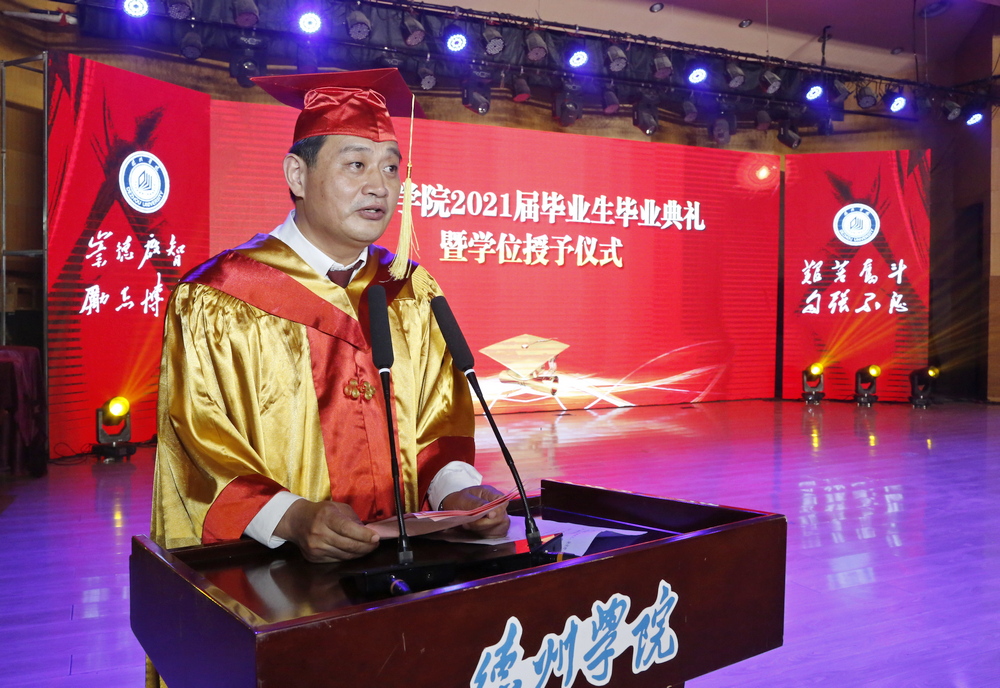 赵胜村致辞,为2021届毕业生送上最美好祝愿和嘱托。他说,从今天开始,同学们将开启一段新的人生旅程。希望你们在学思践悟中坚定理想信念,在奋发有为中践行初心使命,在风霜雪雨中砥砺前行,在创新创业中增长才干,弘扬艰苦奋斗、自强不息的德院精神,在历史的接力赛中,跑出最精彩的一棒;要做终身学习的践行者,学习是你需要坚持一生的生活习惯和方式,需要你们守得住心性、耐得住寂寞,汲取营养、涵养精神,不断成长,不断进步;人生的路上难免会有疾风暴雨、暗礁险滩,只有坚持不懈,历经风雨,才能看到更美的风景,要善于在平凡中创造属于我们自己的精彩。只要听从内心的召唤、不改乐观本色,只要不在困难中气馁、不在逆境中躺平,只要一直坚持、始终在路上,只要千帆阅尽、棱角仍然分明,你们的人生就是精彩的人生!