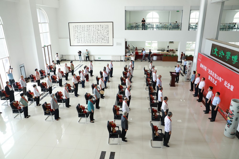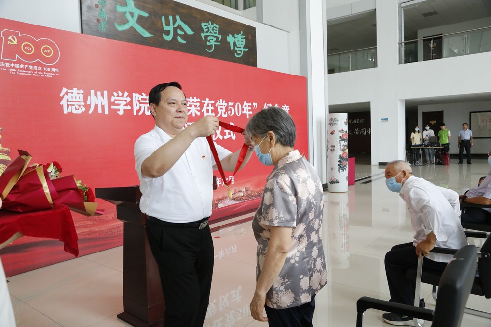 6月17日下午,在中国共产党百年华诞即将到来之际,学校在博文楼一楼大厅举行“光荣在党50年”纪念章颁发仪式。校党委书记车滨出席仪式并讲话,党委副书记王金利,党委委员、副校长张明征,党委委员、纪委书记、省监委驻德州学院监察专员刘继泉,党委委员、组织部部长、统战部部长杨恩红,党委委员、宣传部(教师工作部)部长任立春出席。38名“光荣在党50年”纪念章获得者代表参加仪式。仪式由王金利主持。