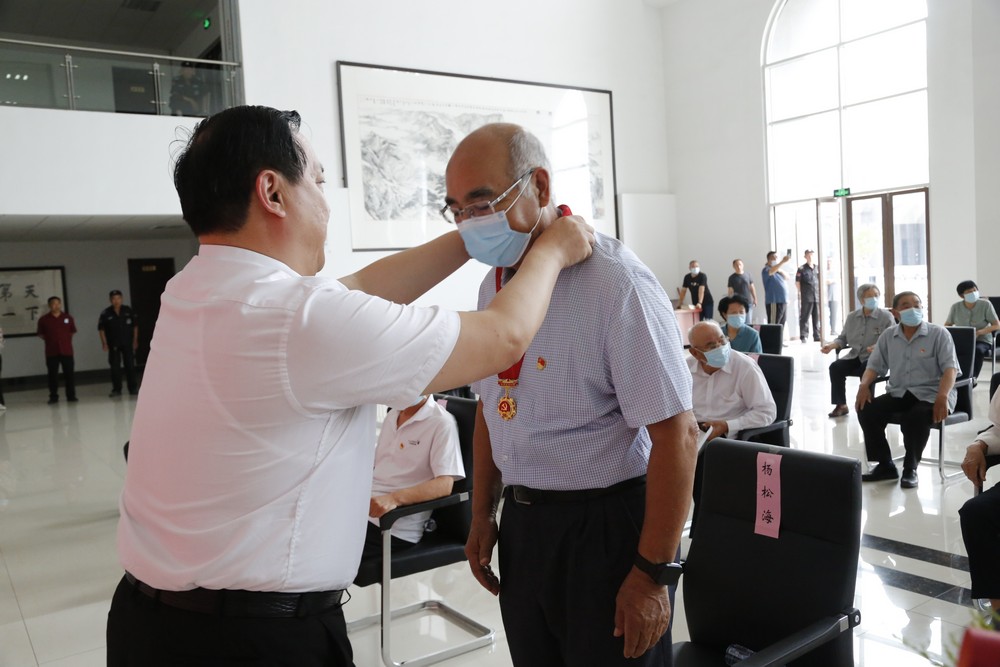 车滨、王金利、张明征、刘继泉、杨恩红、任立春为38名“光荣在党50年”纪念章获得者现场颁发了纪念章。