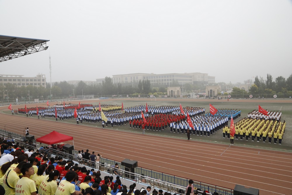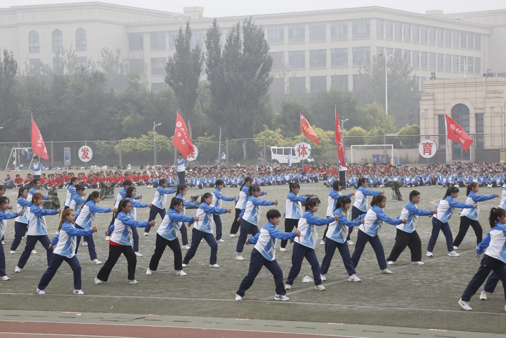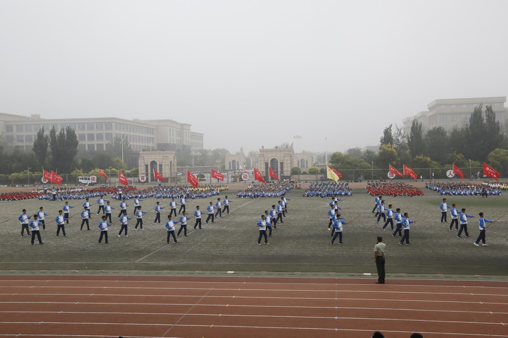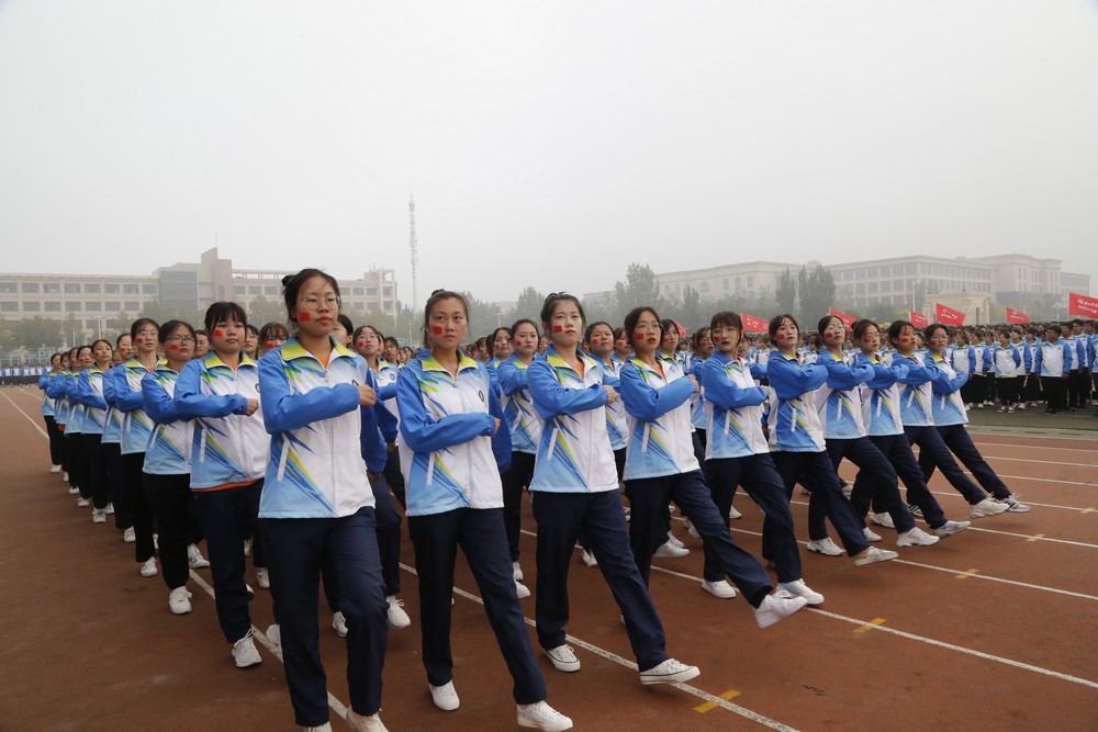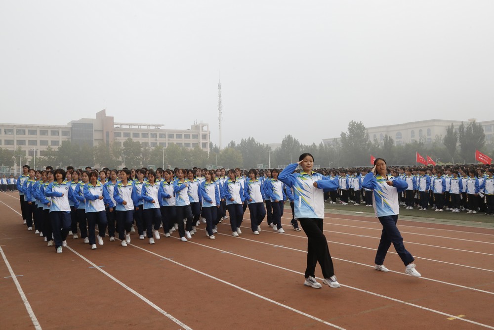 鲜红的国旗在国旗护卫队的护卫下庄严入场,全体师生肃然起立,面向国旗行注目礼。大会在嘹亮的国歌声中拉开序幕,分列式开始。