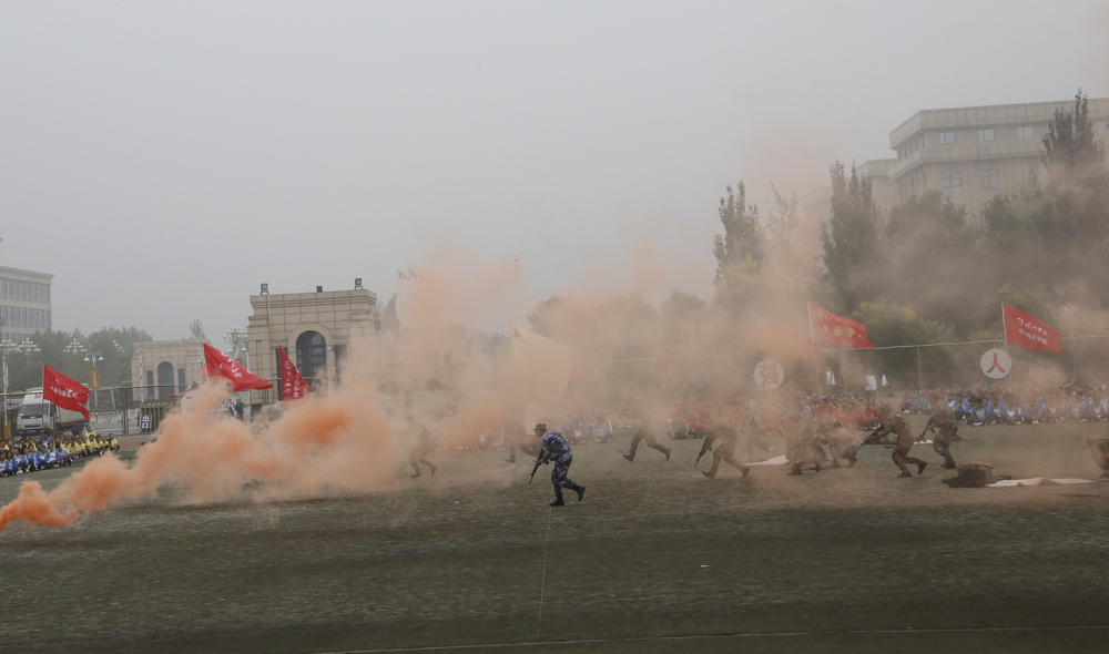 在激昂的军乐声中,训练营方队在国旗方队带领下,迈着坚定有力的步伐,精神抖擞,气宇轩昂,依次走过主席台,他们用威武军姿展示了军训的丰硕成果,用响亮口号喊出了新时代青年的最强音,用铿锵步伐展现了我校大学生昂扬的精神风貌。分列式后,进行了方阵表演、棍操、匕首操、擒敌拳、战术演练等精彩表演。