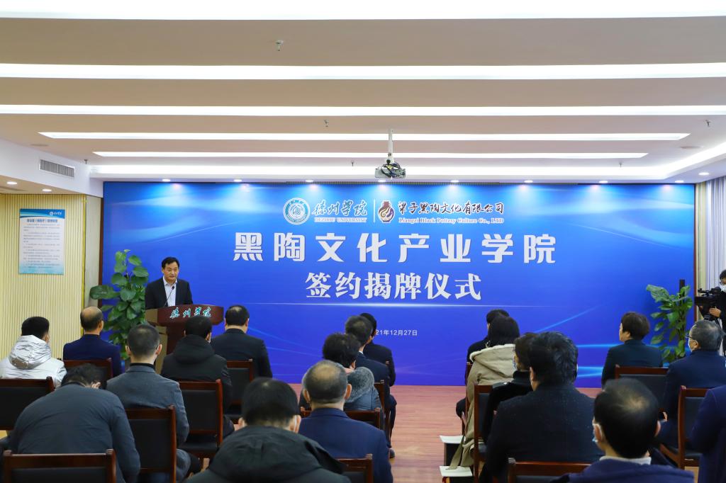 车滨代表学校向各位来宾表示欢迎,向德州市委、市政府长期以来对学校事业发展的支持表示衷心感谢,向共建单位梁子黑陶文化有限公司表示真诚敬意。他表示,共建黑陶文化产业学院,是贯彻落实党的十九届六中全会精神、习近平总书记在中国文联十一大、中国作协十大开幕式上的重要讲话精神的具体行动,是我校服务地方文化产业高质量发展的必然要求,是实现校企优势互补、合作共赢的有力举措,是我校服务德州文化产业发展的重要一步,也是推进政产学研深度融合,缔造新型校地关系、打造校企之间命运共同体的关键一步,这对加强产教融合、培养高素质应用型人才具有重要意义。学校将继续强化应用型高校建设定位,与共建单位携手培养文化产业发展的亟需人才,促进课程内容与技术发展衔接、达到教学过程与生产过程融合;建立高层次人才共享机制,搭建文化产业创新发展平台,共同申报科研实验平台,共同弘扬传统文化产业,助力德州文化产业繁荣发展。学校将以共建黑陶文化产业学院为契机,以满足人民精神文化需求为导向,建设更多对接我市文化产业链的应用型专业群,搭建更多产学研合作平台,培养更多坚守艺术理想、追求德艺双馨的文化产业应用型人才,为德州文化产业蓬勃发展做出新的更大贡献。