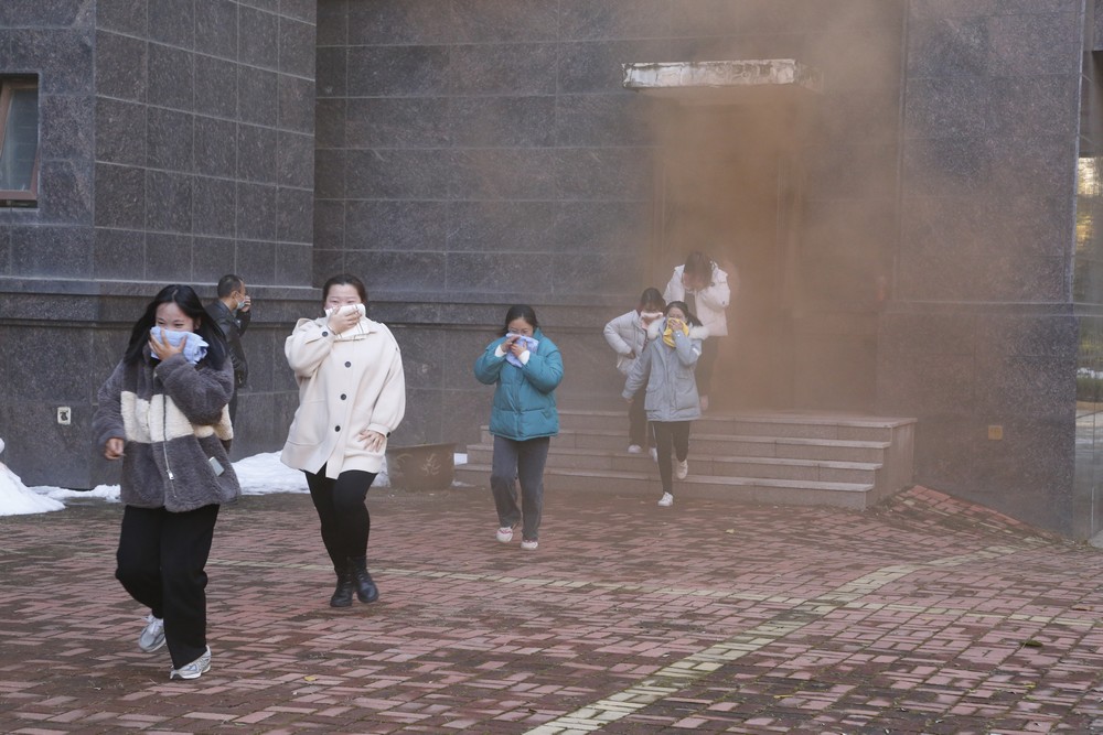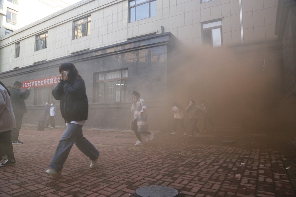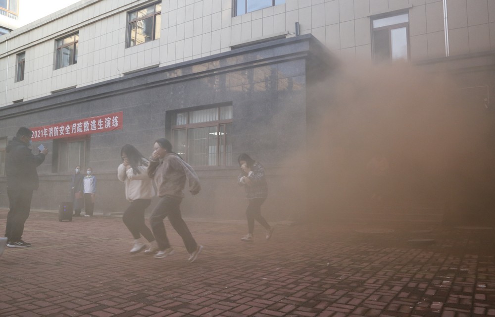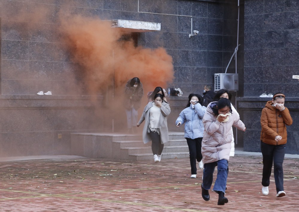 下午4时,参演学生在24号公寓楼内天井集合,保卫处负责人作动员讲话。在工作人员点燃烟雾弹,吹响警报后,疏散逃生演练正式开始。