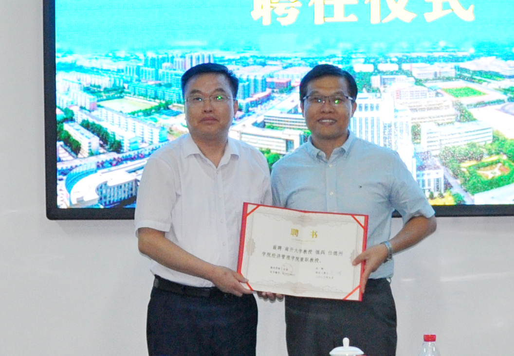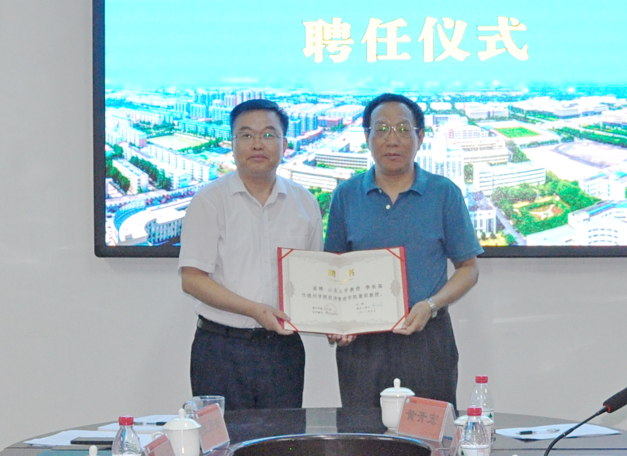 会上,举行了德州学院兼职教授聘任仪式。赵长林向李长英教授、张兵教授颁发了德州学院兼职教授聘书。