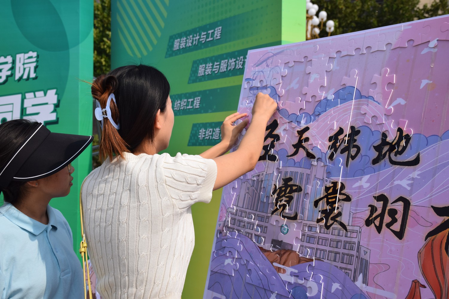 纺织服装学院为每位新生准备了拼图,让学生用心感受自己拼就的“经天纬地 霓裳羽衣”。