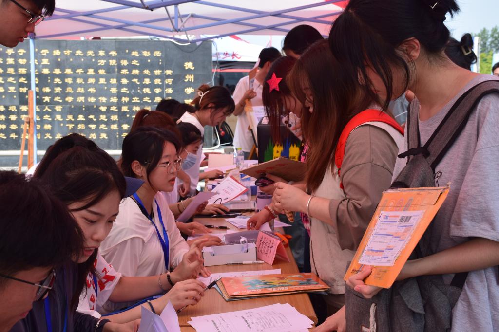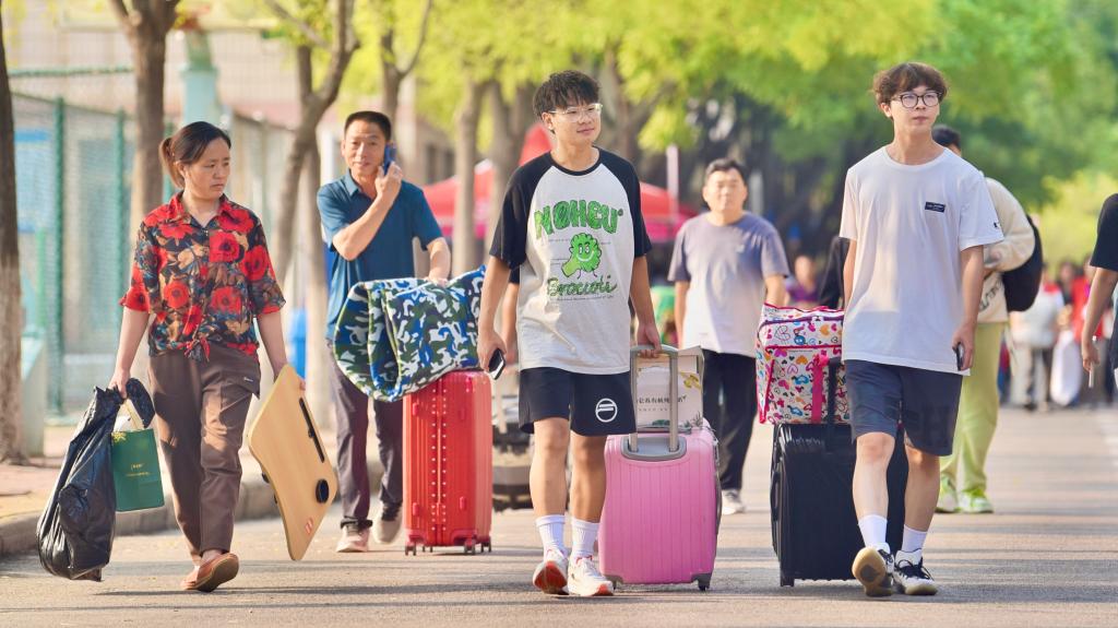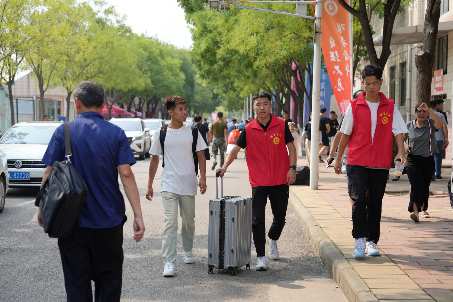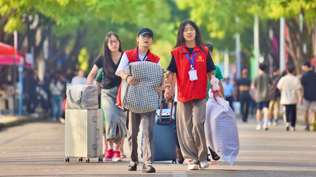 数百名身穿红马甲的学生志愿者为新生提供报到、引导等服务,成为校园一道独特的风景线。
